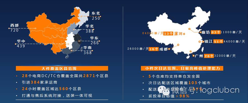 具体来说就是流程和业务先行,数据作为血液,IT实现作为骨架和支撑,做一个“全网直配”的标准产品。在工厂端,可以定制生产和下线直发;在智能云仓,可以进行库存共享、仓间调拨;在发挥干线运输优势的同时,依托于强大的终端网点,可以开展同城配配送与最后一公里业务:形成覆盖全国100公里以内24小时,200公里以内48小时标准化配送网络,这个标准网络是由全国86个物流中心形成节点,首先形成省内对流,再形成全国对流,最终变成面向整个C端的物流方案的提供者。